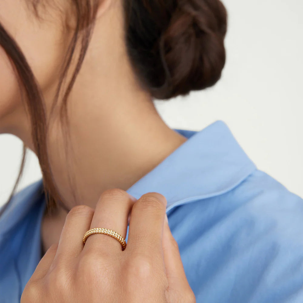 Its tactile texture and radiant finish make it a timeless favorite — easy to wear alone for a minimalist glow or stacked to add a touch of golden dimension.