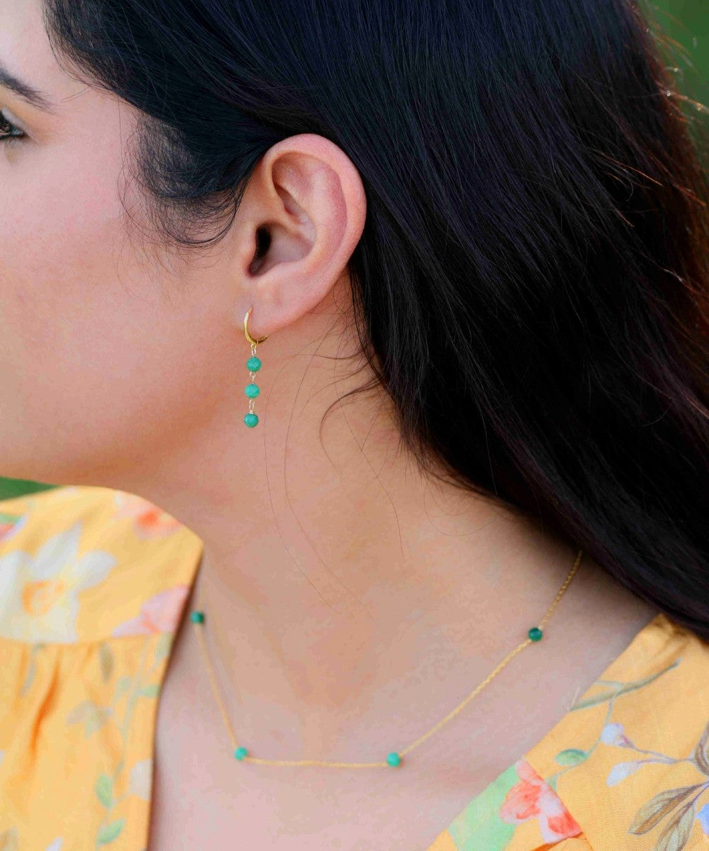 Three rich green malachite stones hang gracefully in a vertical row from each hoop, their signature swirls echoing the wisdom and rhythm of the earth. Set in glowing 18K gold vermeil over sterling silver, these earrings offer a striking contrast of elegance and earthiness — perfect for everyday confidence or soulful statement moments.