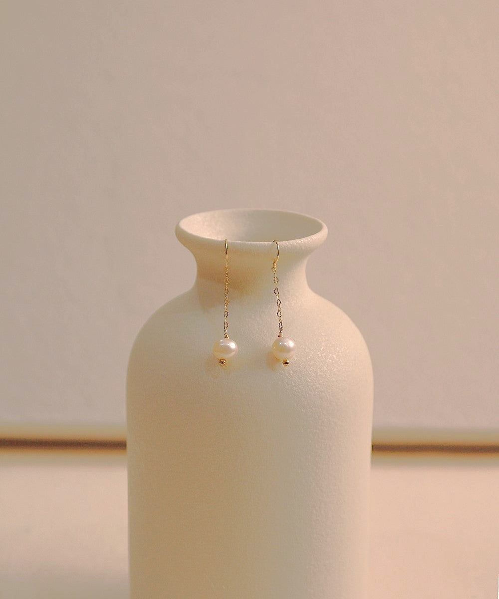 Each earring features a single 6mm potato pearl, gently suspended from a fine 18K gold-filled chain, allowing the pearl to sway with subtle, graceful movement. The soft luster of the pearl is beautifully contrasted by the warm golden tones, creating a timeless silhouette that flatters every moment.
