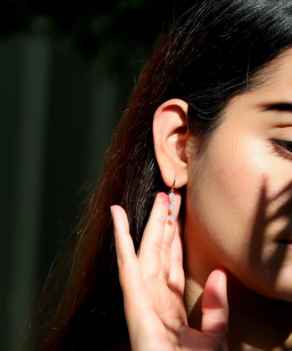 Three natural aquamarine stones dangle gracefully, one beneath the other, from a radiant 18K gold vermeil hoop, creating a gentle waterfall of soft blue shimmer. Known as the stone of the sea, aquamarine brings clarity, calm, and emotional balance — like a quiet tide that soothes the soul.